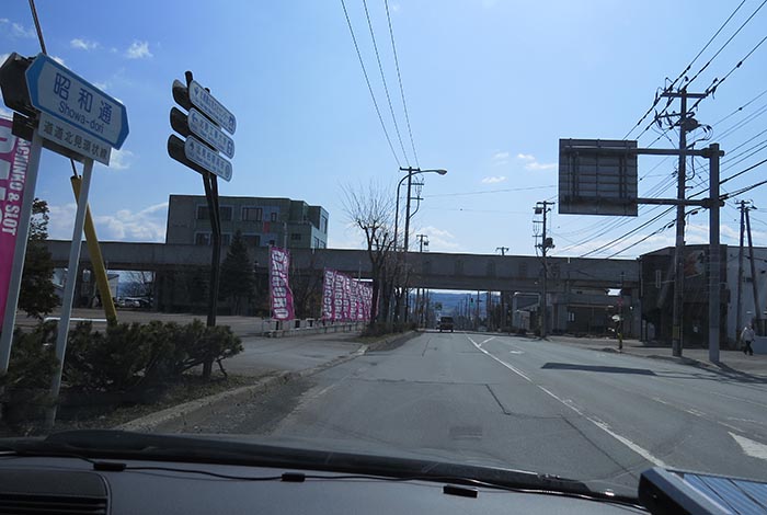 前方がJR石北本線高架橋、写真右が北見駅方向