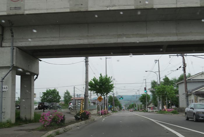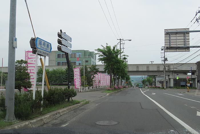 前方がJR石北本線高架橋、写真右が北見駅方向