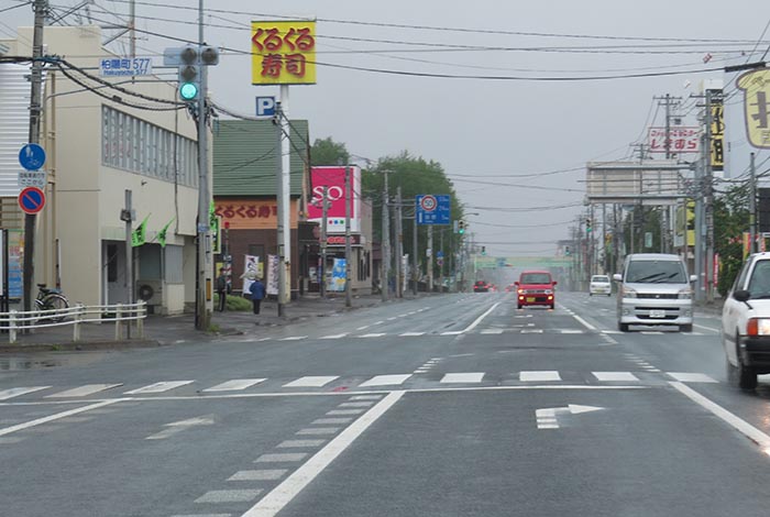 午前9時20分、国道39号常盤町の五差路から左は石北峠・旭川・札幌方面