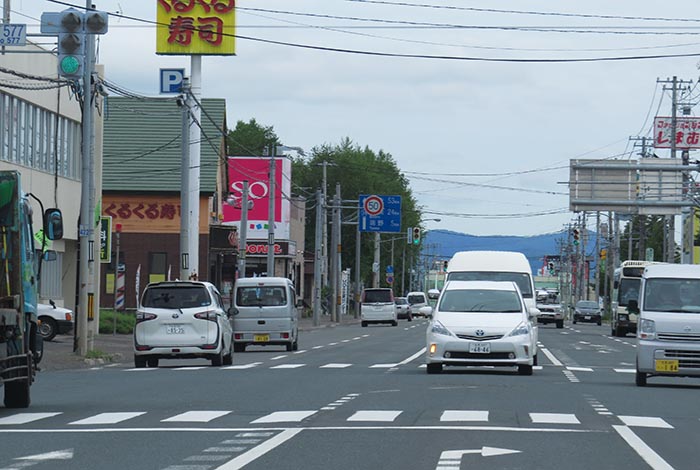 国道39号、東6号線昭和通り交差点から奥は端野、美幌、網走、知床方面