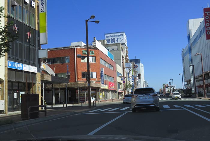 西4丁目通りの奥がオホーツクビールおよび山下通りの交差点方向