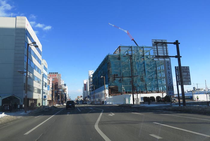 西4丁目通りの奥がオホーツクビールおよび山下通りの交差点方向