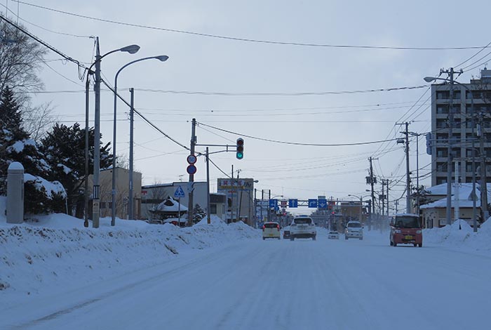 午前9時20分、国道39号の五差路から左は石北峠・旭川・札幌方面