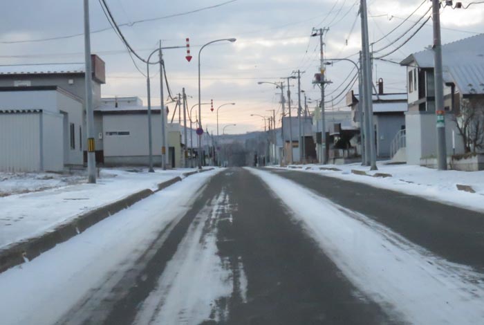 産岸通りから左折して西5号線のバス停前から北光通り方向