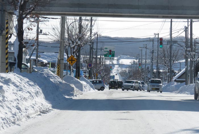 前方がJR石北本線高架橋、写真右が北見駅方向