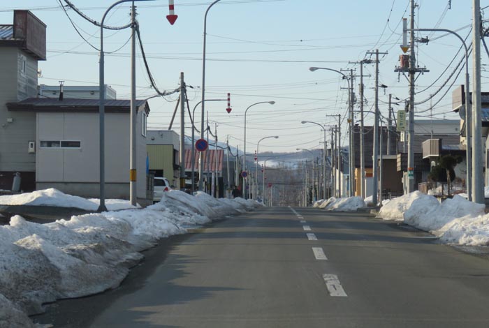 産岸通りから左折して西5号線のバス停前から北光通り方向