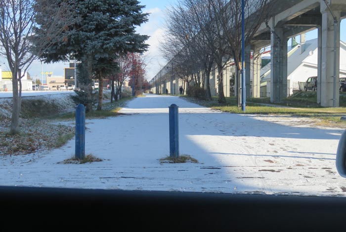 前方がJR石北本線高架橋、写真右が北見駅方向