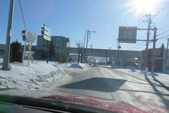 前方がJR石北本線高架橋、写真右が北見駅方向