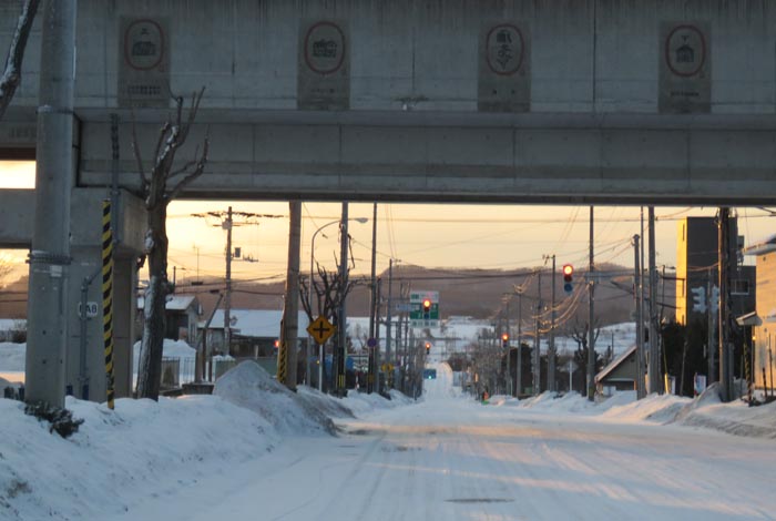前方がJR石北本線高架橋、写真右が北見駅方向