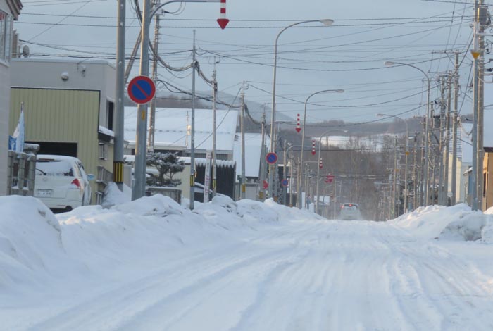 産岸通りから左折して西5号線のバス停前から北光通り方向