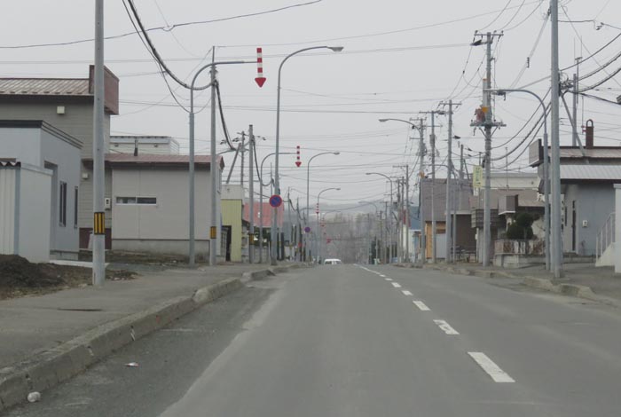 産岸通りから左折して西5号線のバス停前から北光通り方向