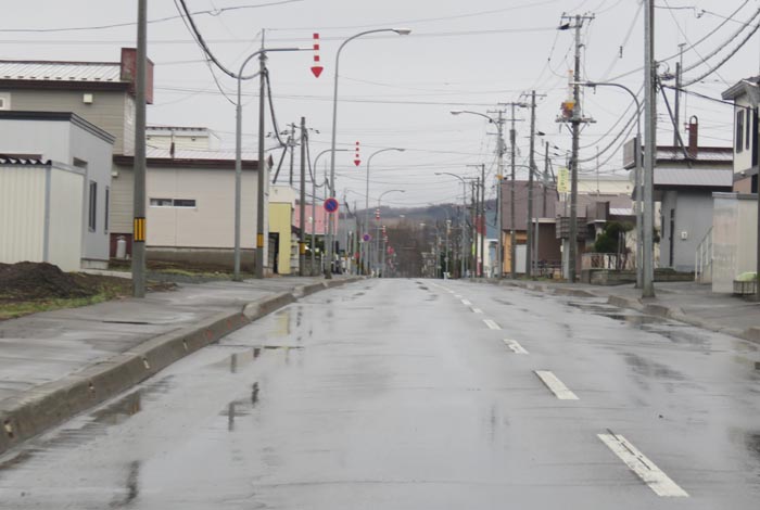 産岸通りから左折して西5号線のバス停前から北光通り方向