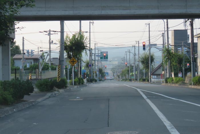 前方がJR石北本線高架橋、写真右が北見駅方向