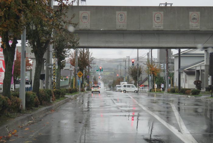 前方がJR石北本線高架橋、写真右が北見駅方向