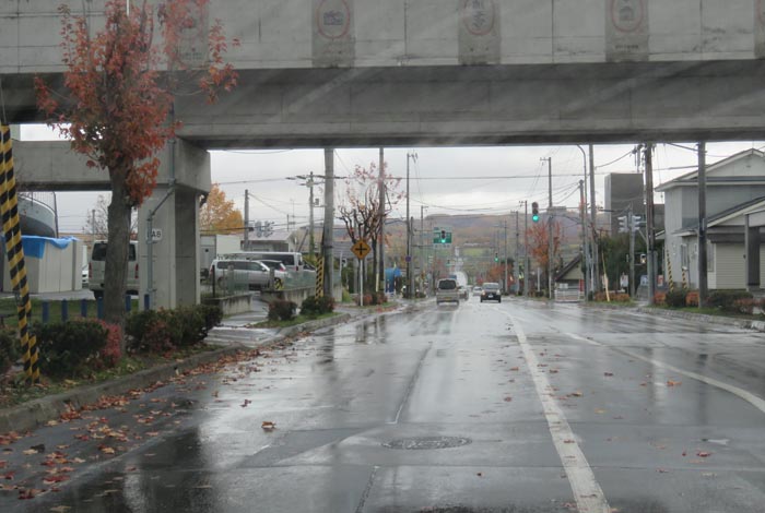 前方がJR石北本線高架橋、写真右が北見駅方向