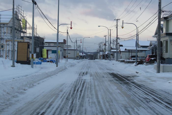 産岸通りから左折して西5号線のバス停前から北光通り方向