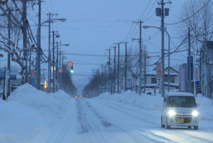 午前6時40分、南岸通り、野付牛自動車学校前から無加川町方向