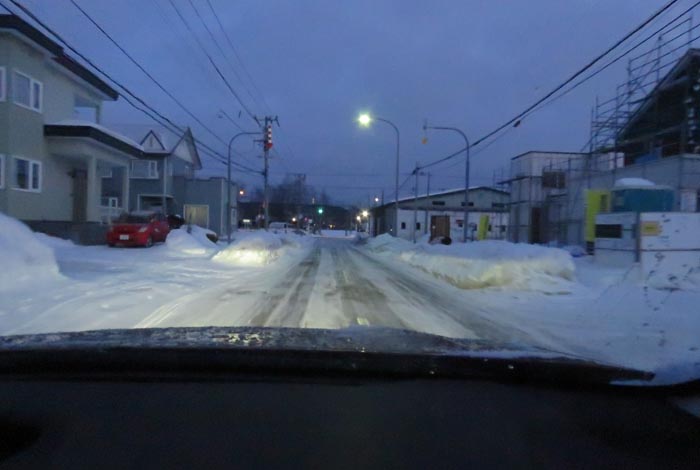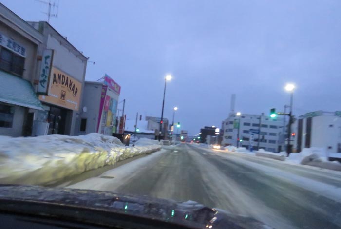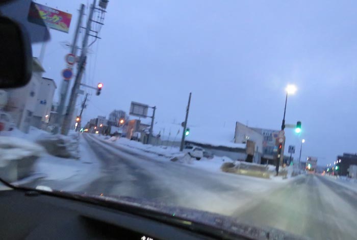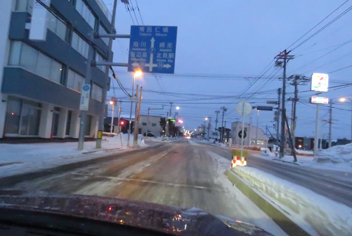 南岸通り、野付牛自動車学校前、奥がとん田通りの交差点
