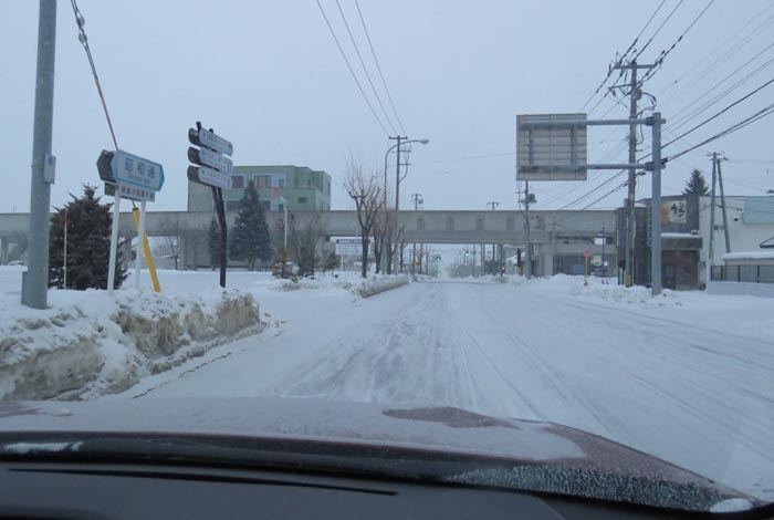 前方がJR石北本線高架橋、写真右が北見駅方向