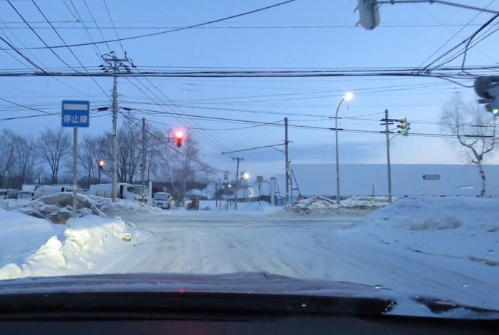 南岸通り、野付牛自動車学校前、奥がとん田通りの交差点