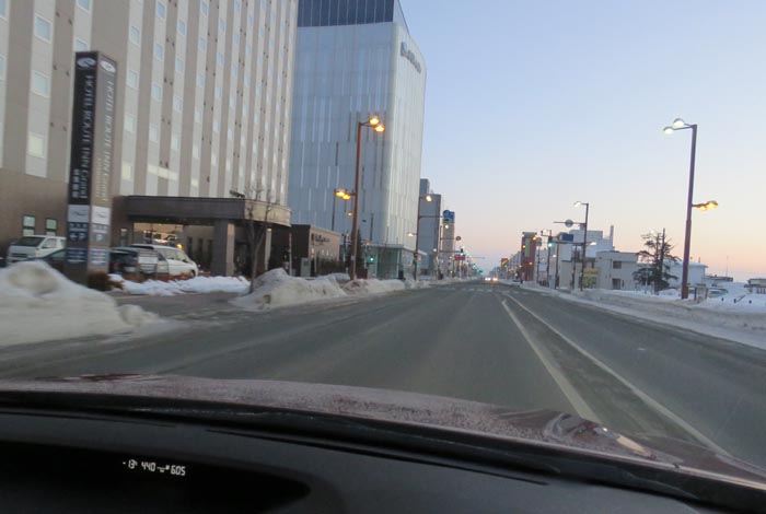 午前6時00分、国道39号の五差路から左は石北峠・旭川・札幌方面