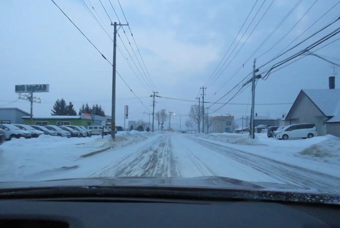 南岸通り、野付牛自動車学校前、奥がとん田通りの交差点