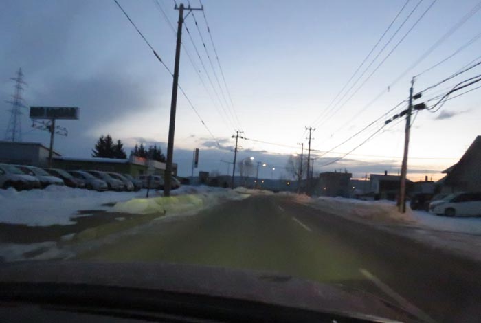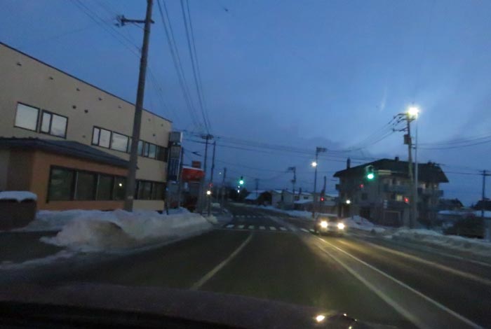 南岸通り、野付牛自動車学校前、奥がとん田通りの交差点