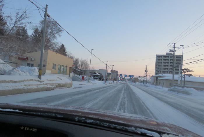 午前6時00分、国道39号の五差路から左は石北峠・旭川・札幌方面