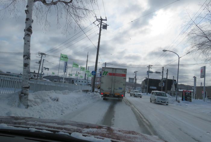 末広町の南岸通り、西4号線バス停前から野付牛自動車学校方向