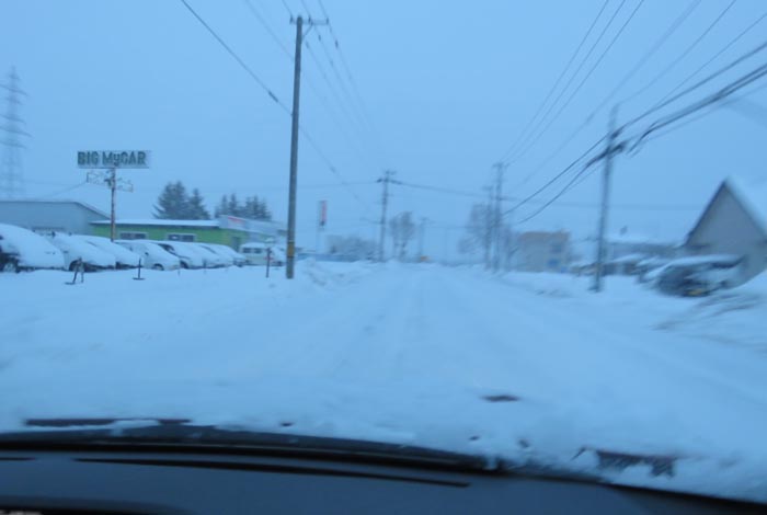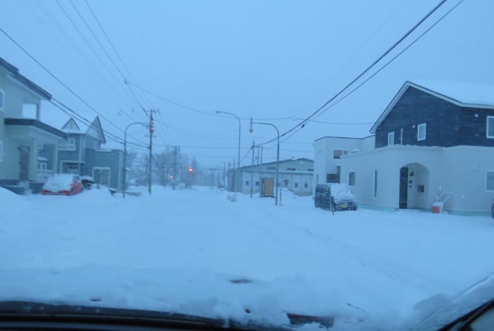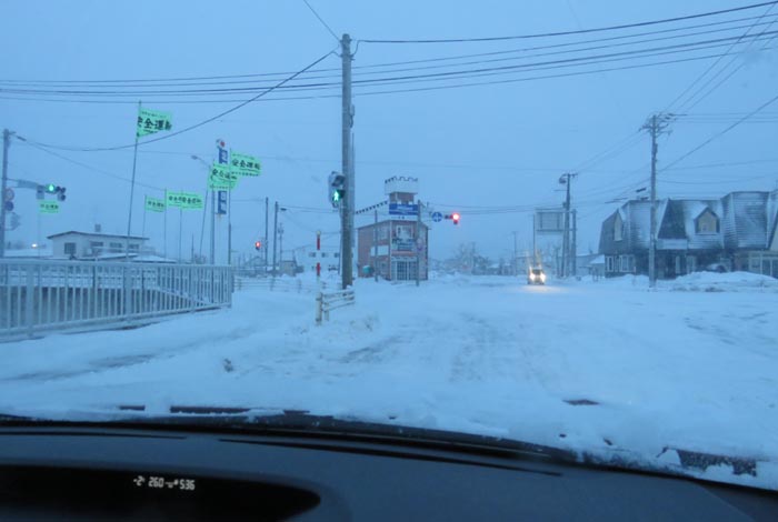 南岸通り、野付牛自動車学校前、奥がとん田通りの交差点