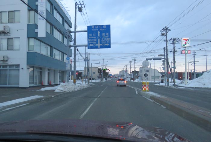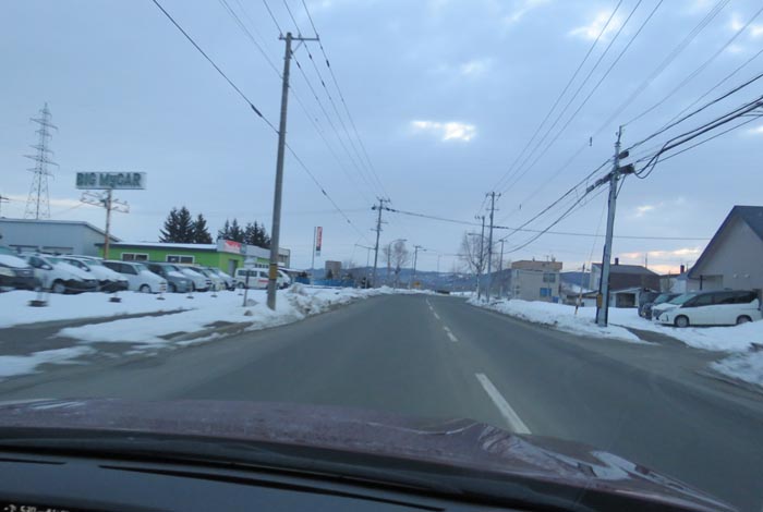 南岸通り、野付牛自動車学校前、奥がとん田通りの交差点