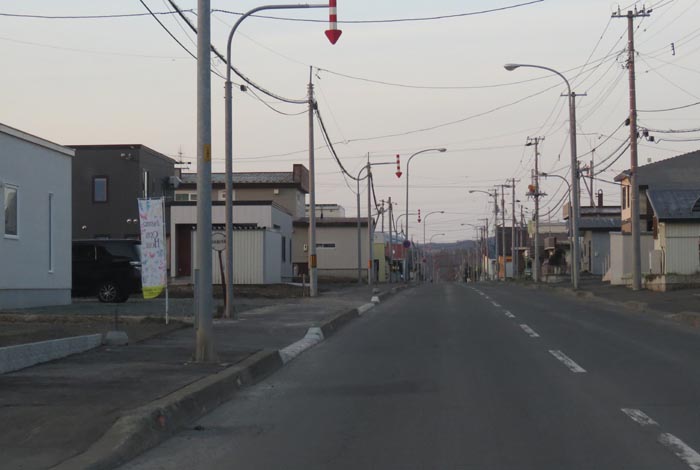 産岸通りから左折して西5号線のバス停前から北光通り交差点方向