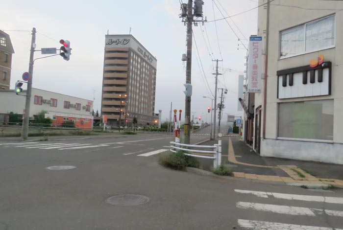 写真奥が五差路、写真右は北見市民会館側