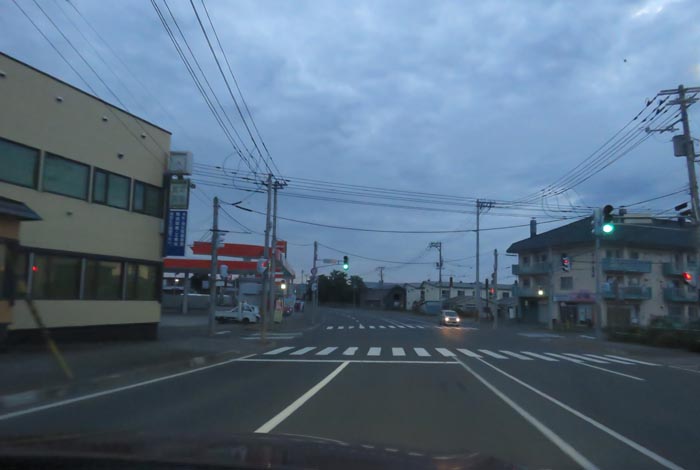 南岸通り、野付牛自動車学校前、前方はとん田通りの交差点