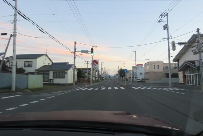 南岸通り、野付牛自動車学校前、前方はとん田通りの交差点