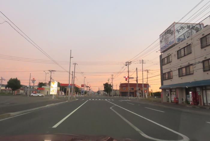 南岸通り、野付牛自動車学校前、前方はとん田通りの交差点