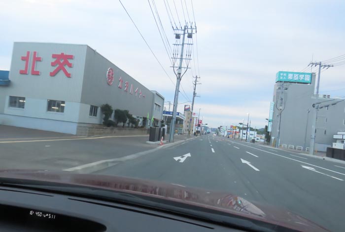 南岸通り、野付牛自動車学校前、前方はとん田通りの交差点