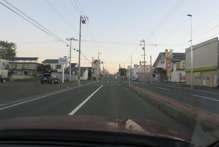 南岸通り、野付牛自動車学校前、前方はとん田通りの交差点