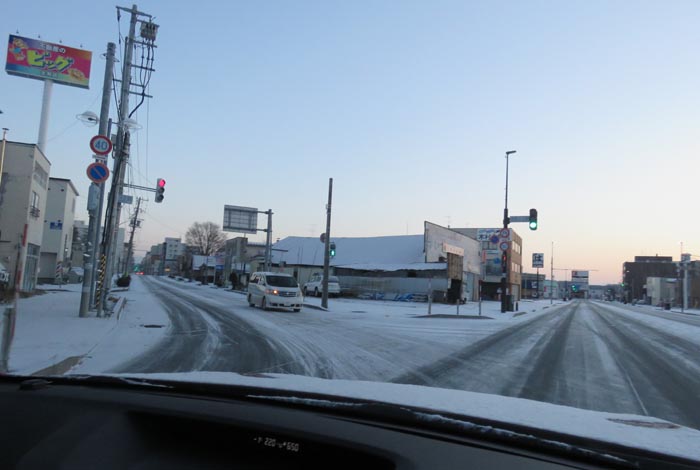 南岸通り、野付牛自動車学校前、前方はとん田通りの交差点