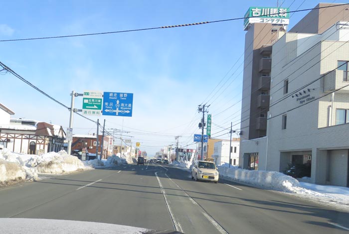 午前9時10分、国道39号の五差路から左は石北峠・旭川・札幌方面
