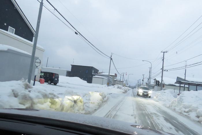 産岸通りから左折して西5号線のバス停前から北光通り交差点方向