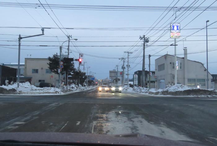 南岸通り、野付牛自動車学校前、前方はとん田通りの交差点