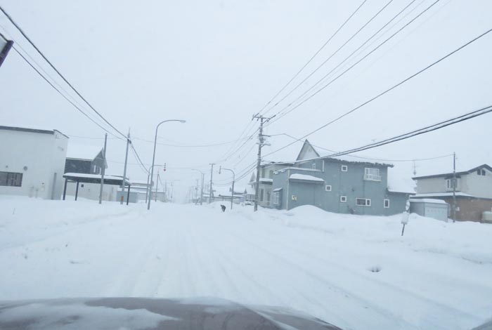 産岸通りから左折して西5号線のバス停前から北光通り交差点方向