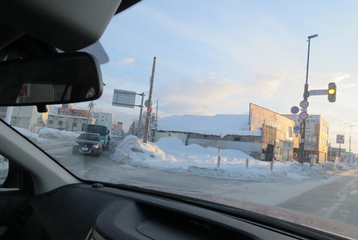 末広町の南岸通り、西4号線バス停前から野付牛自動車学校方向