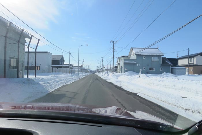 産岸通りから左折して西5号線のバス停前から北光通り交差点方向