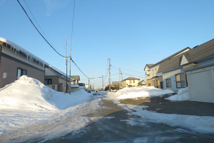 産岸通りから左折して西5号線のバス停前から北光通り交差点方向