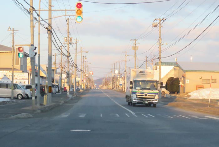 午前5時50分、南岸通り、野付牛自動車学校前から無加川町方向