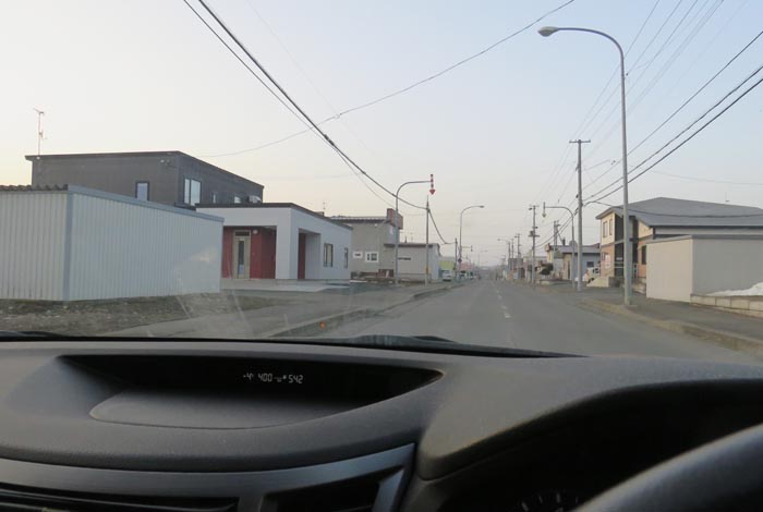 産岸通りから左折して西5号線のバス停前から北光通り交差点方向