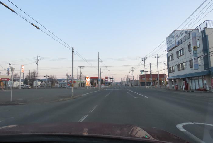 南岸通り、野付牛自動車学校前、前方はとん田通りの交差点