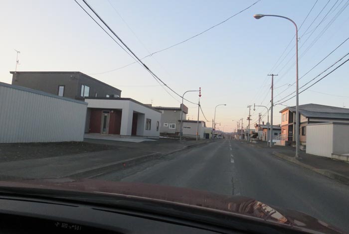 産岸通りから左折して西5号線のバス停前から北光通り交差点方向